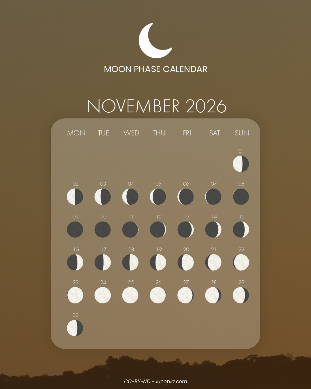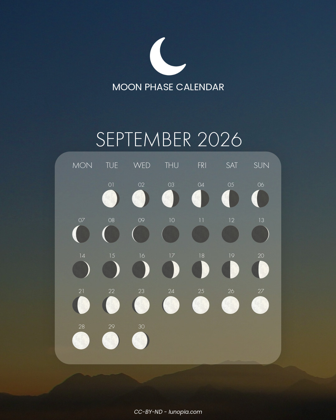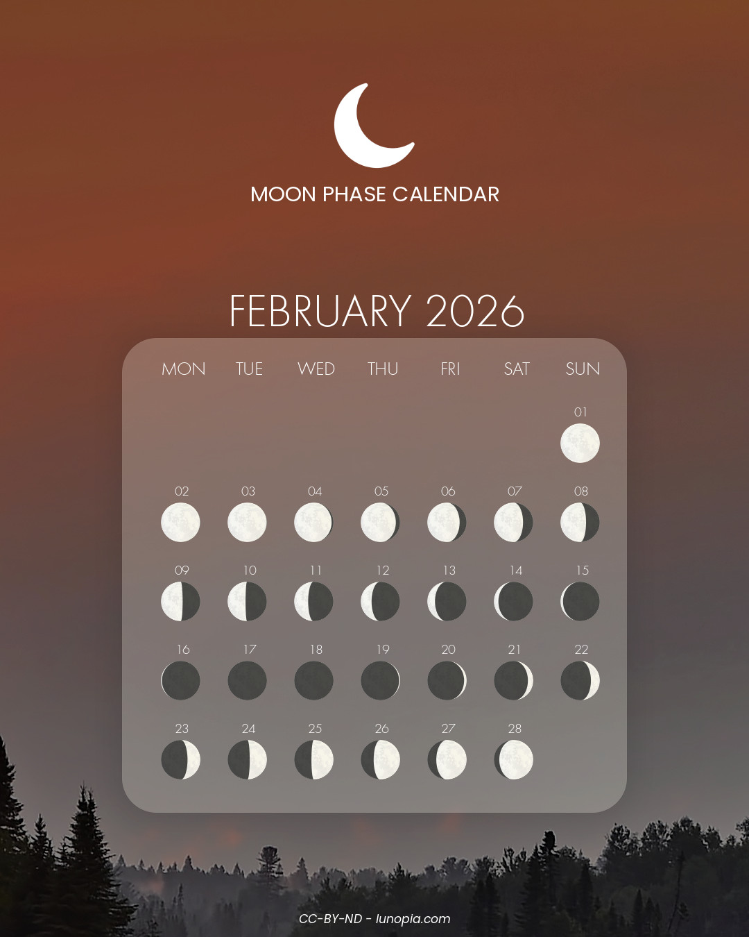 | Wednesday, 18 February 2026Wed. 18 | 🌒 | 0 % | Waxing crescent |