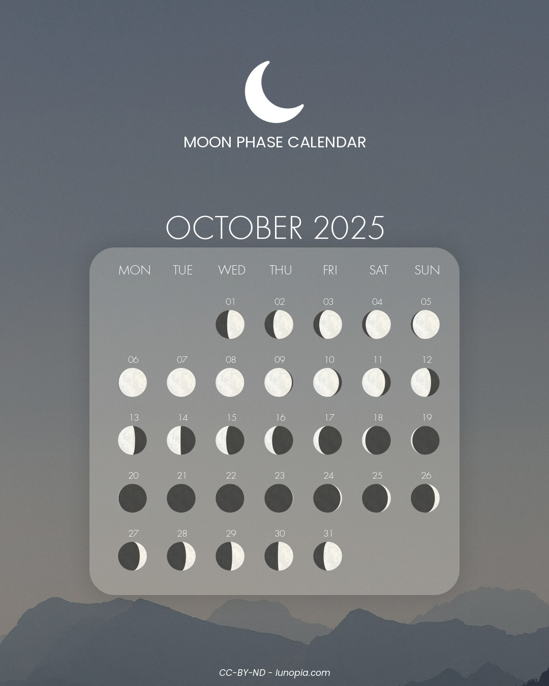 | Tuesday, 21 October 2025Tue. 21 | 🌑 | 0 % | New moon |