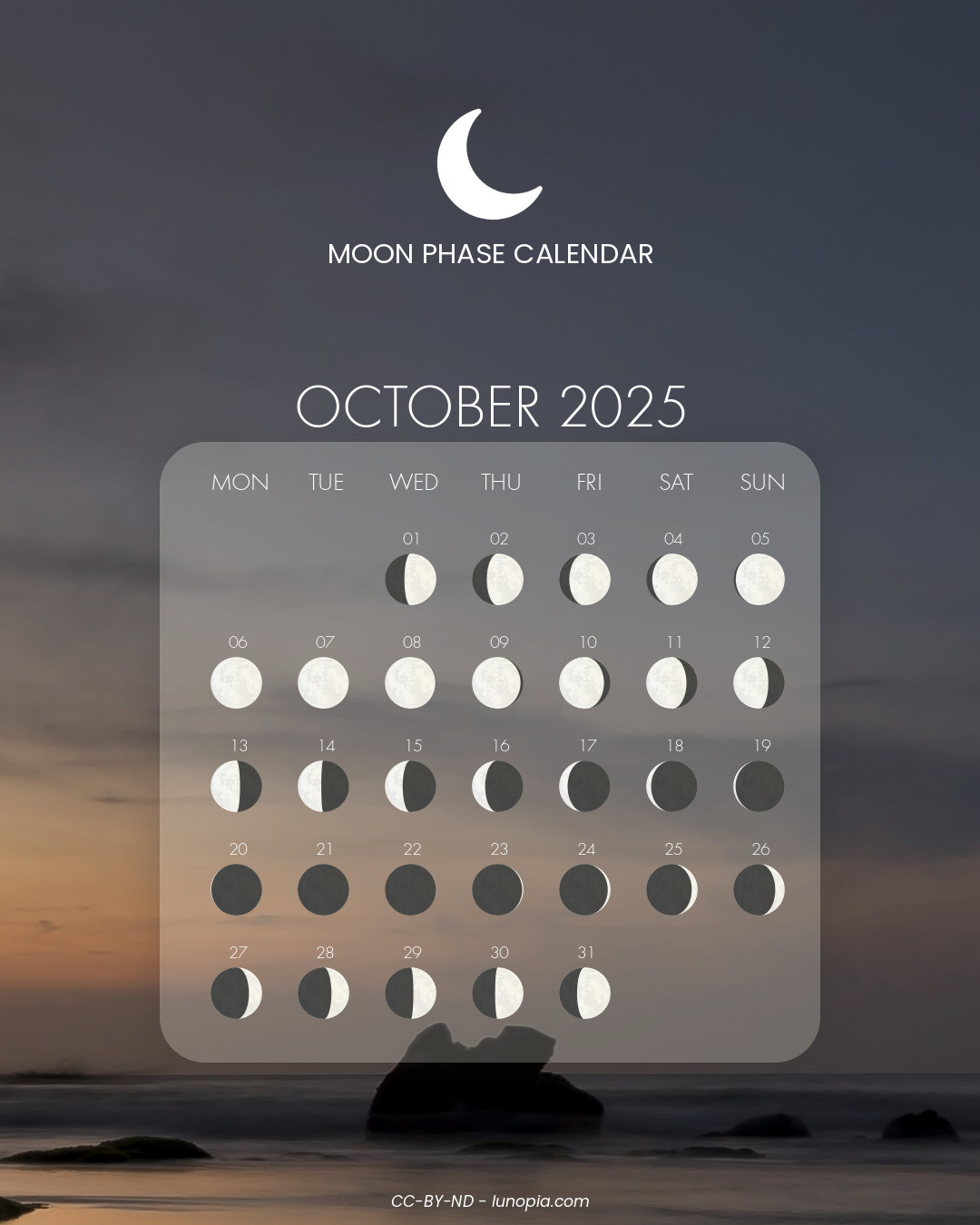 | Saturday, October 18, 2025Sat. 18 | 🌘 | 10 % | Waning crescent |