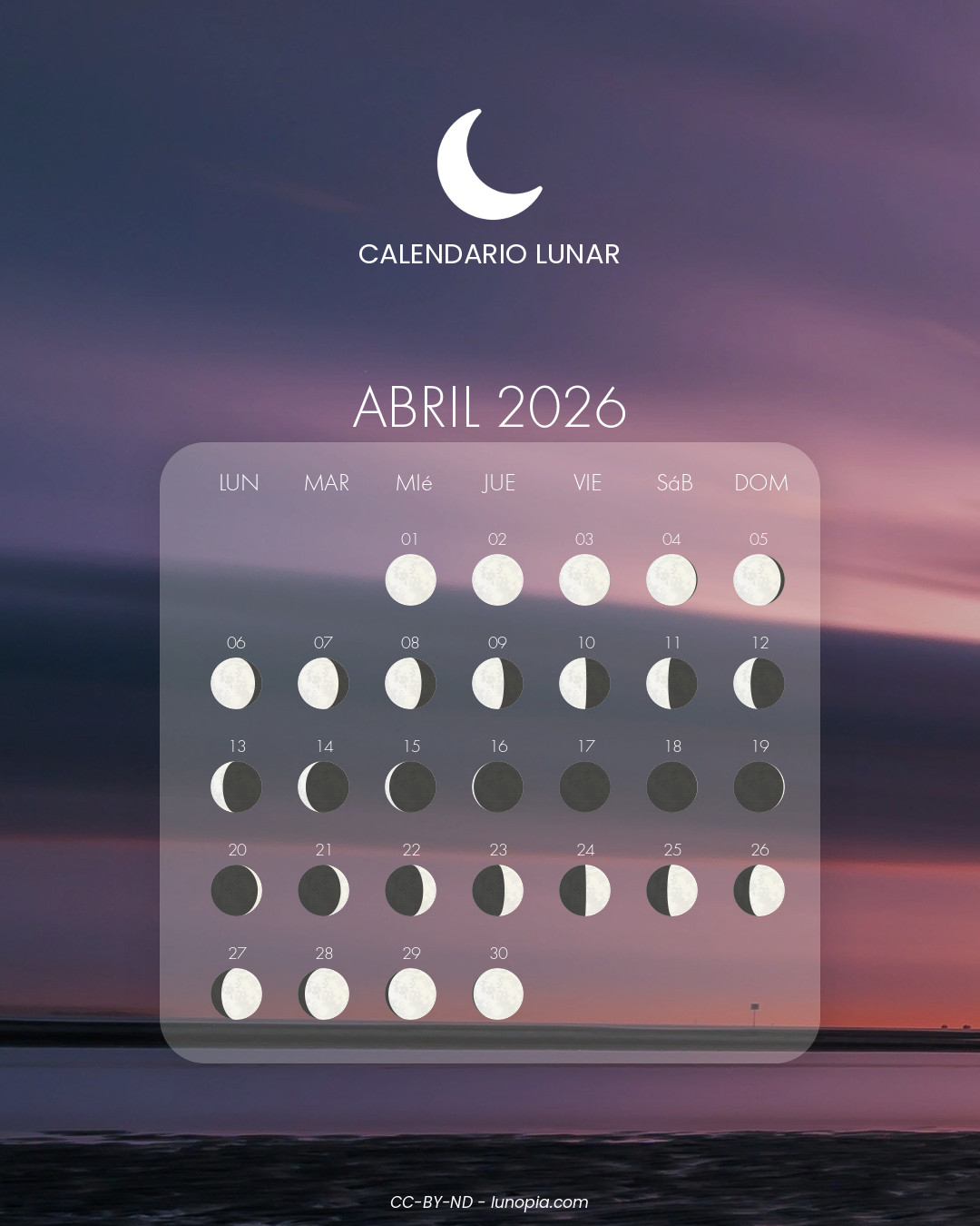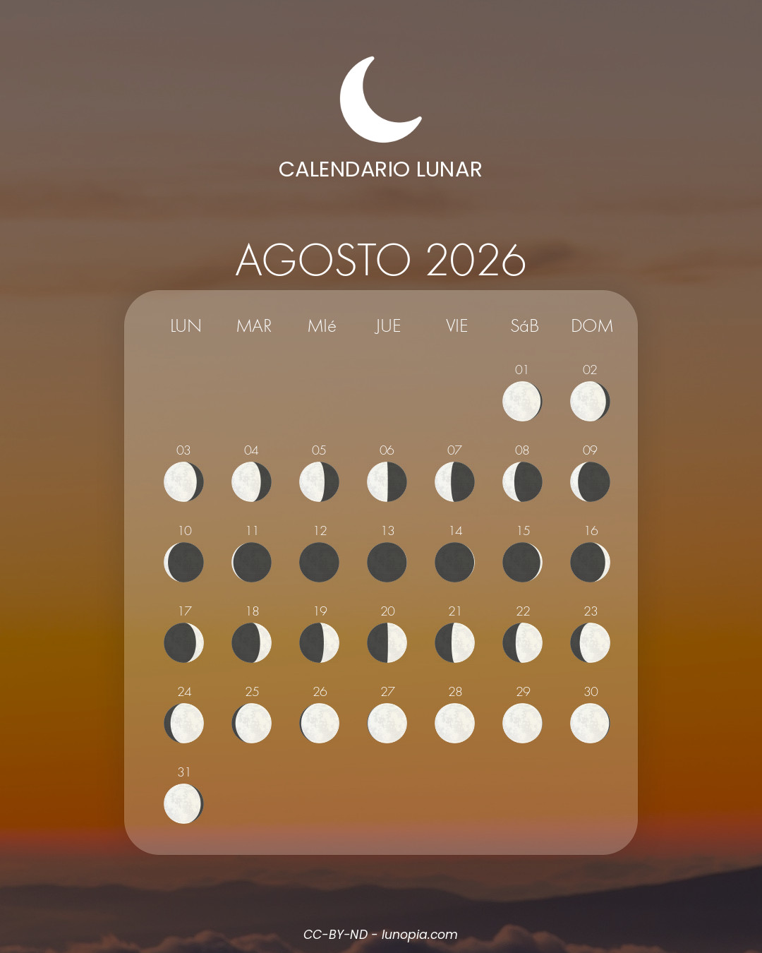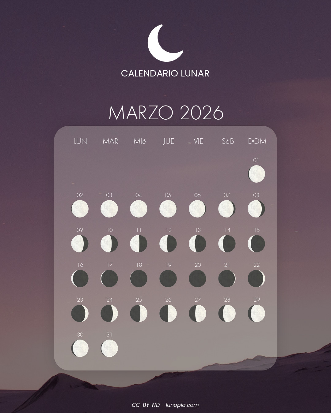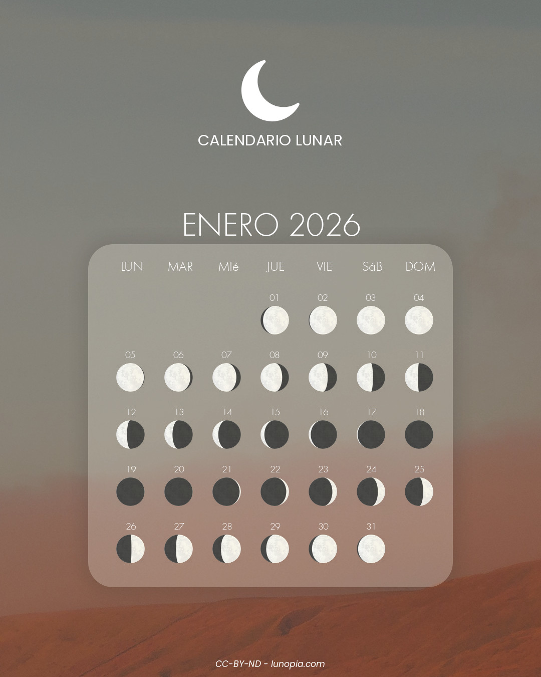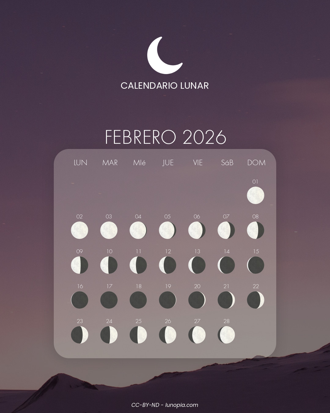 | Domingo, 01 de febrero de 2026Dom. 01 | 🌕 | 100 % | Luna llena |