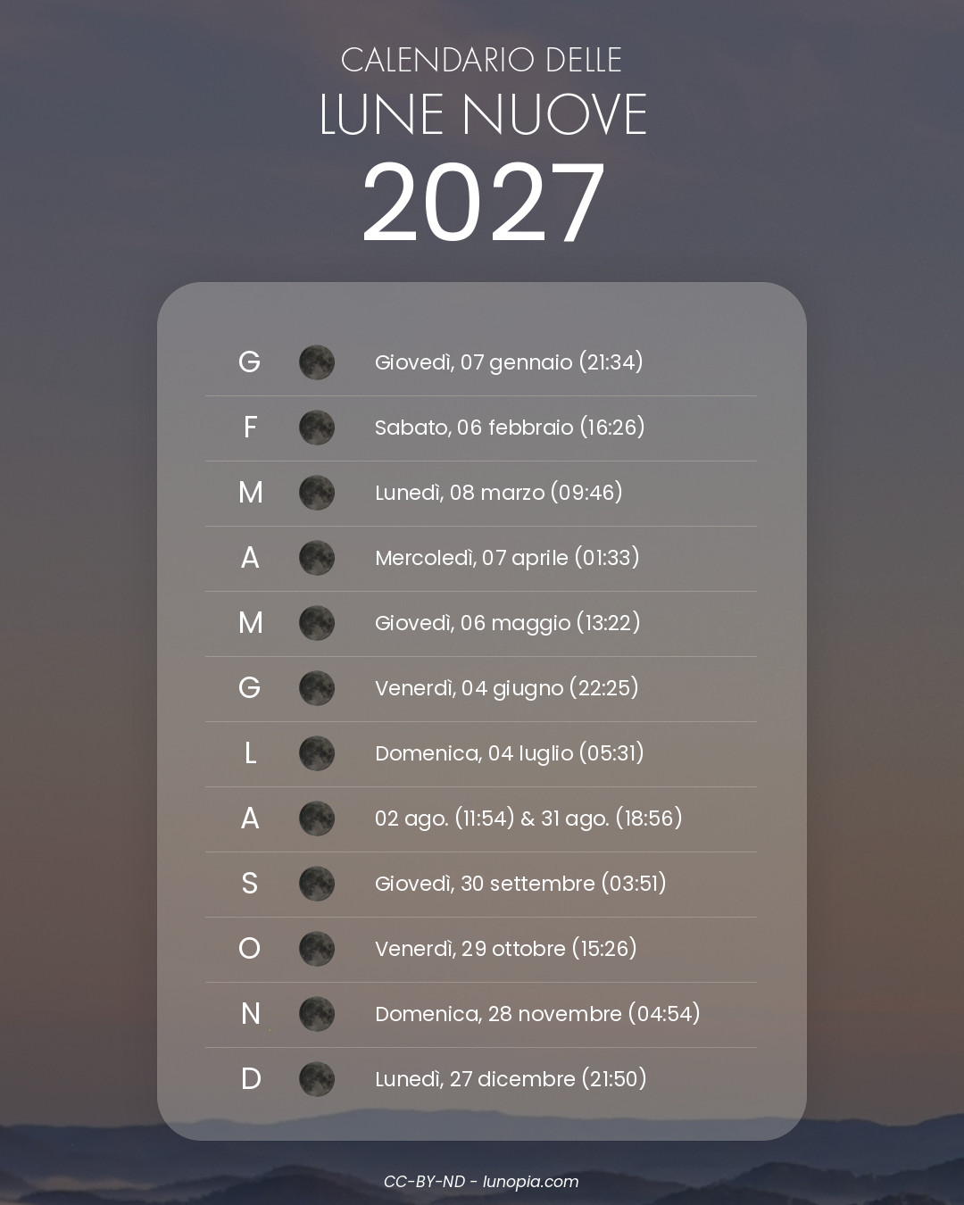 La prossima luna nuova avrà luogo il martedì, 17 febbraio 2026 alle 12:57 (tra 13 giorni).