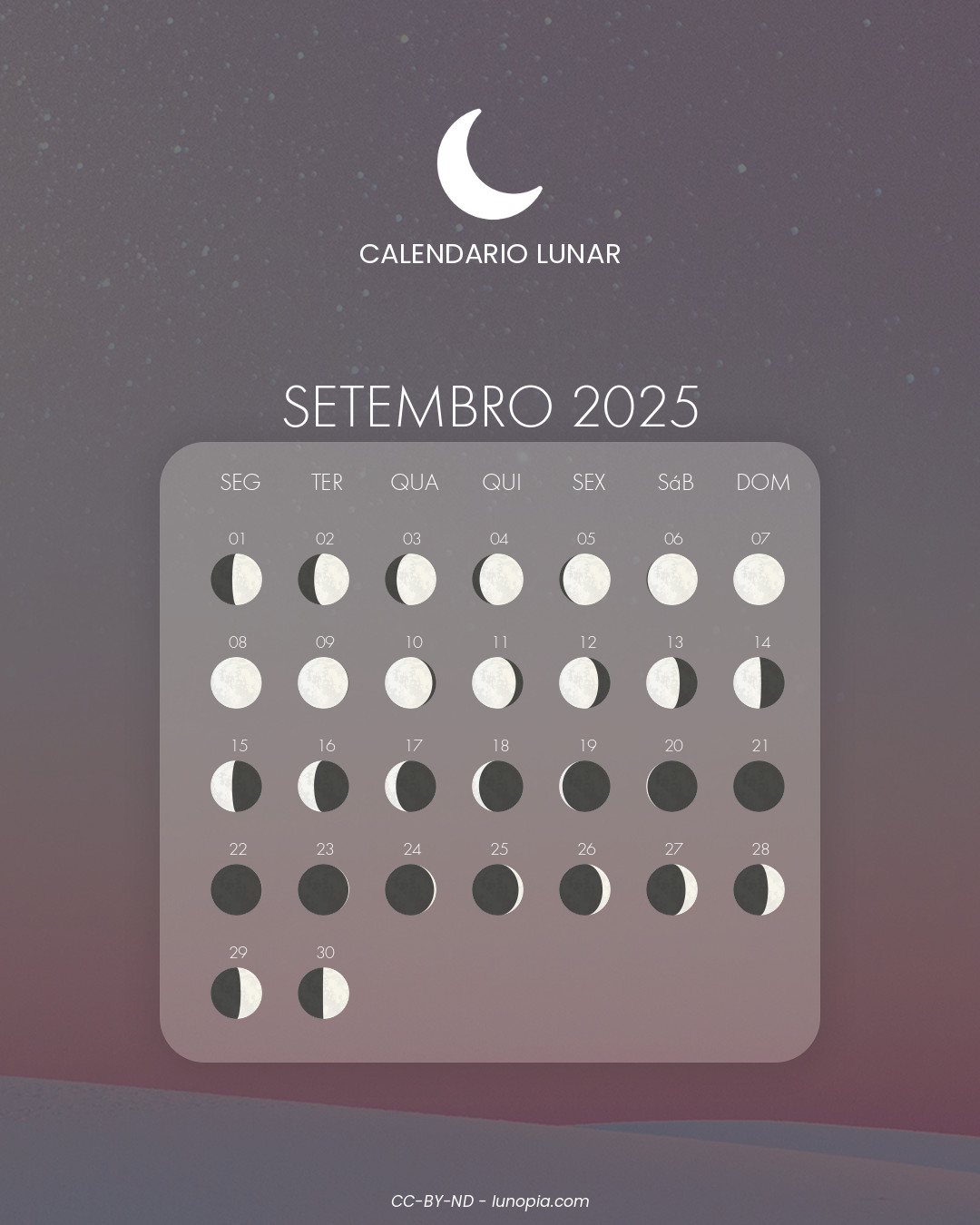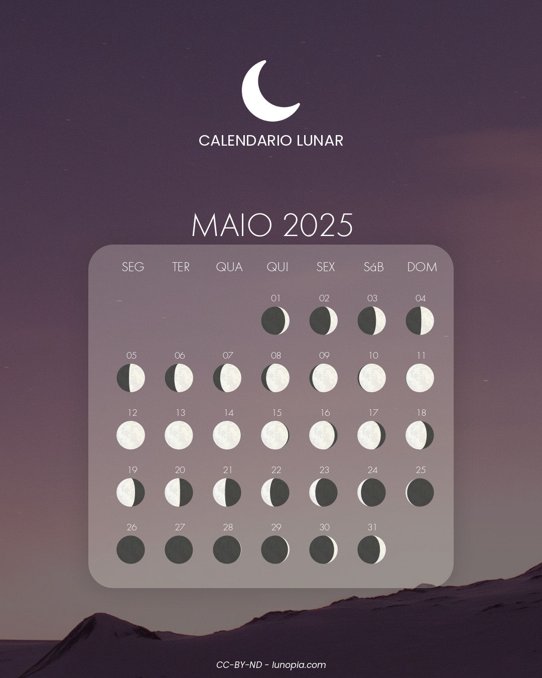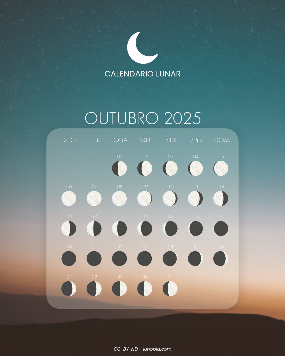 | Sábado, 25 de outubro de 2025Sáb. 25 | 🌒 | 12 % | Lua crescente |