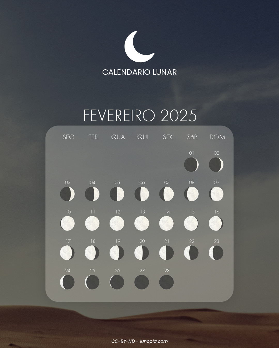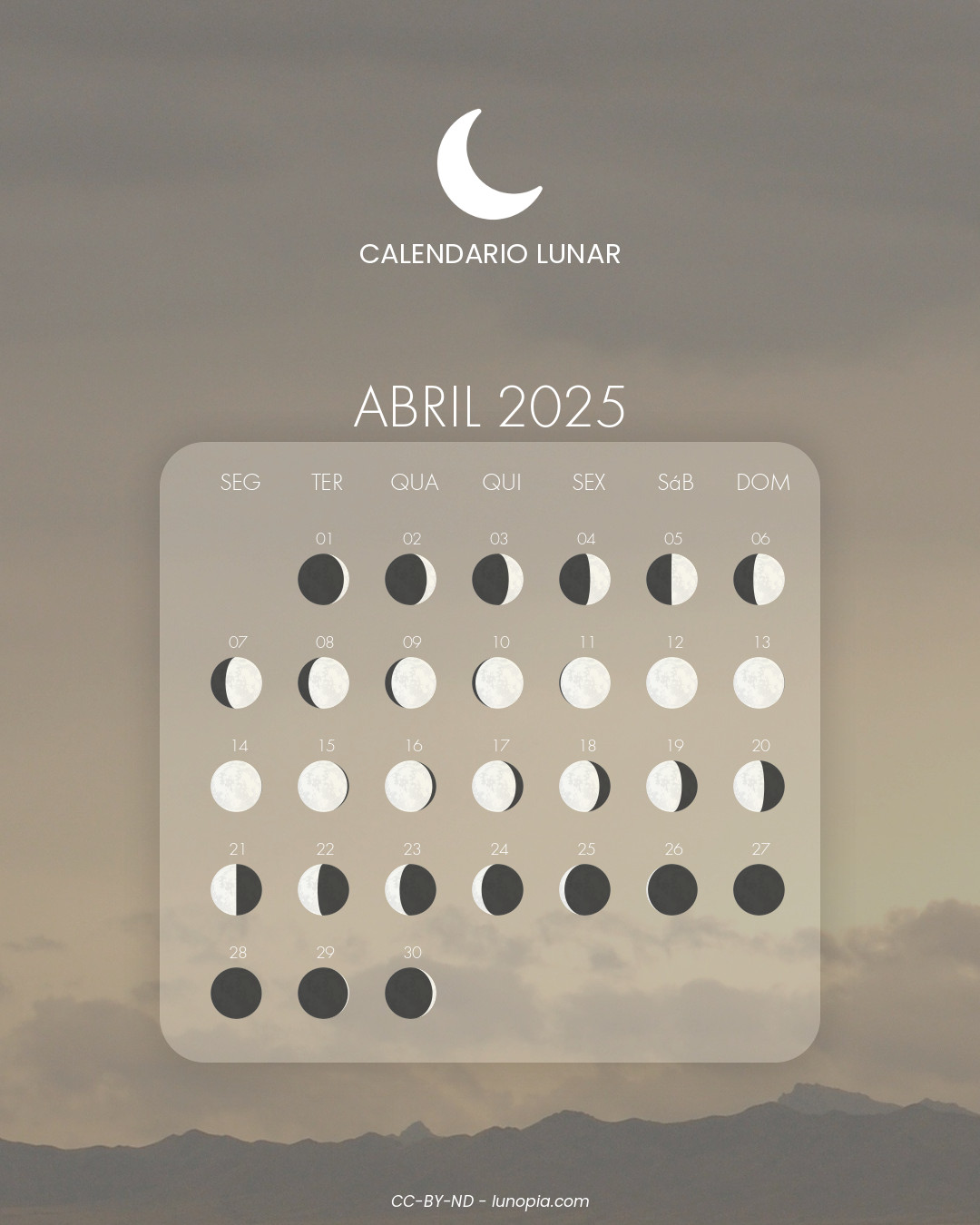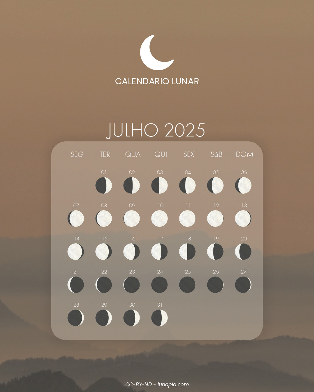 | Sábado, 25 de outubro de 2025Sáb. 25 | 🌒 | 12 % | Lua crescente |