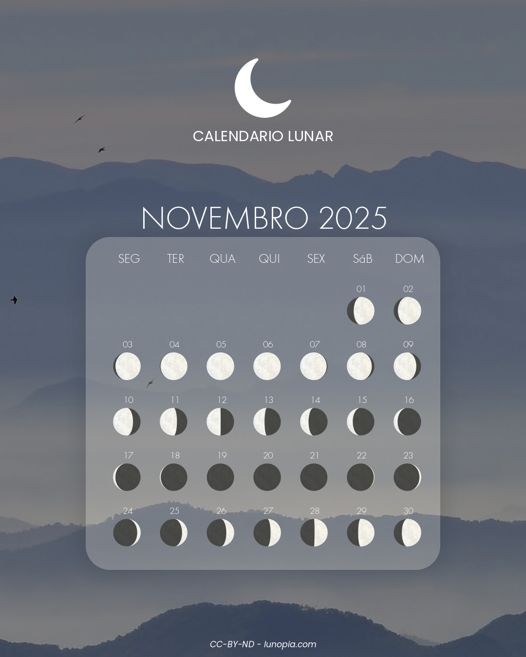 | Quinta-feira, 30 de outubro de 2025Qui. 30 | 🌓 | 55 % | Quarto crescente |
