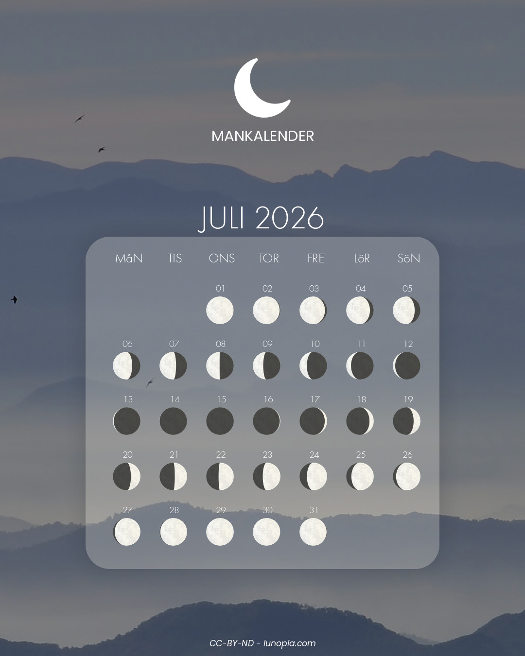 | Torsdag 05 februari 2026Tors 05 | 🌖 | 89 % | Avtagande halvmåne |