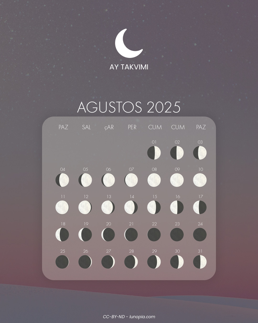 Aşağıdaki ay takvimi, ayın her gün için evrelerini ve takımyıldızlarını gösterir. Balıkçılık ve tarım gibi doğayla ilgili faaliyetlerin planlanması için kullanılır, aynı zamanda manevi uygulamalar ve ritüeller için de kullanılır.