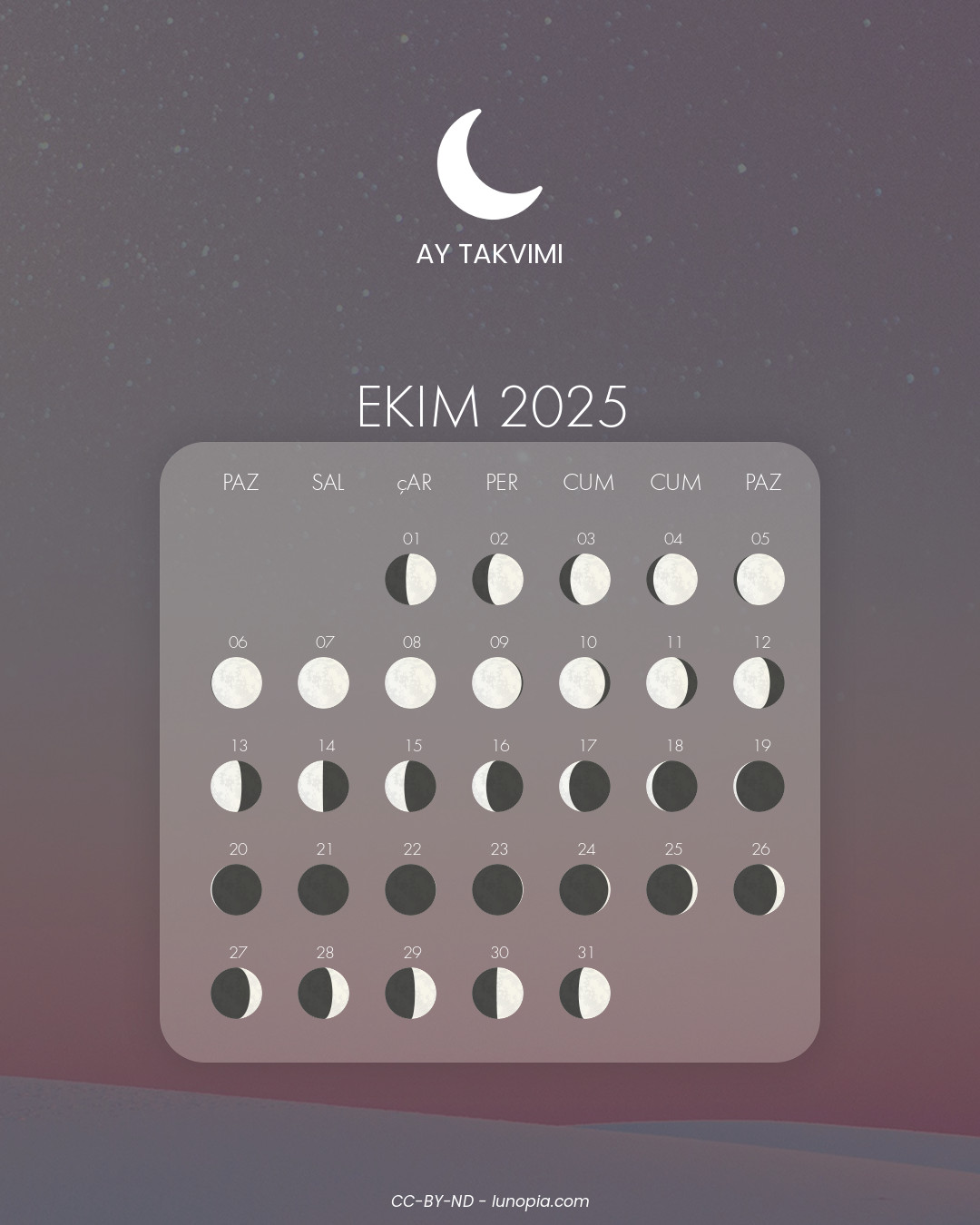 | Cuma 24 ekim 2025Cum 24 | 🌒 | 5 % | Ilk hilal |