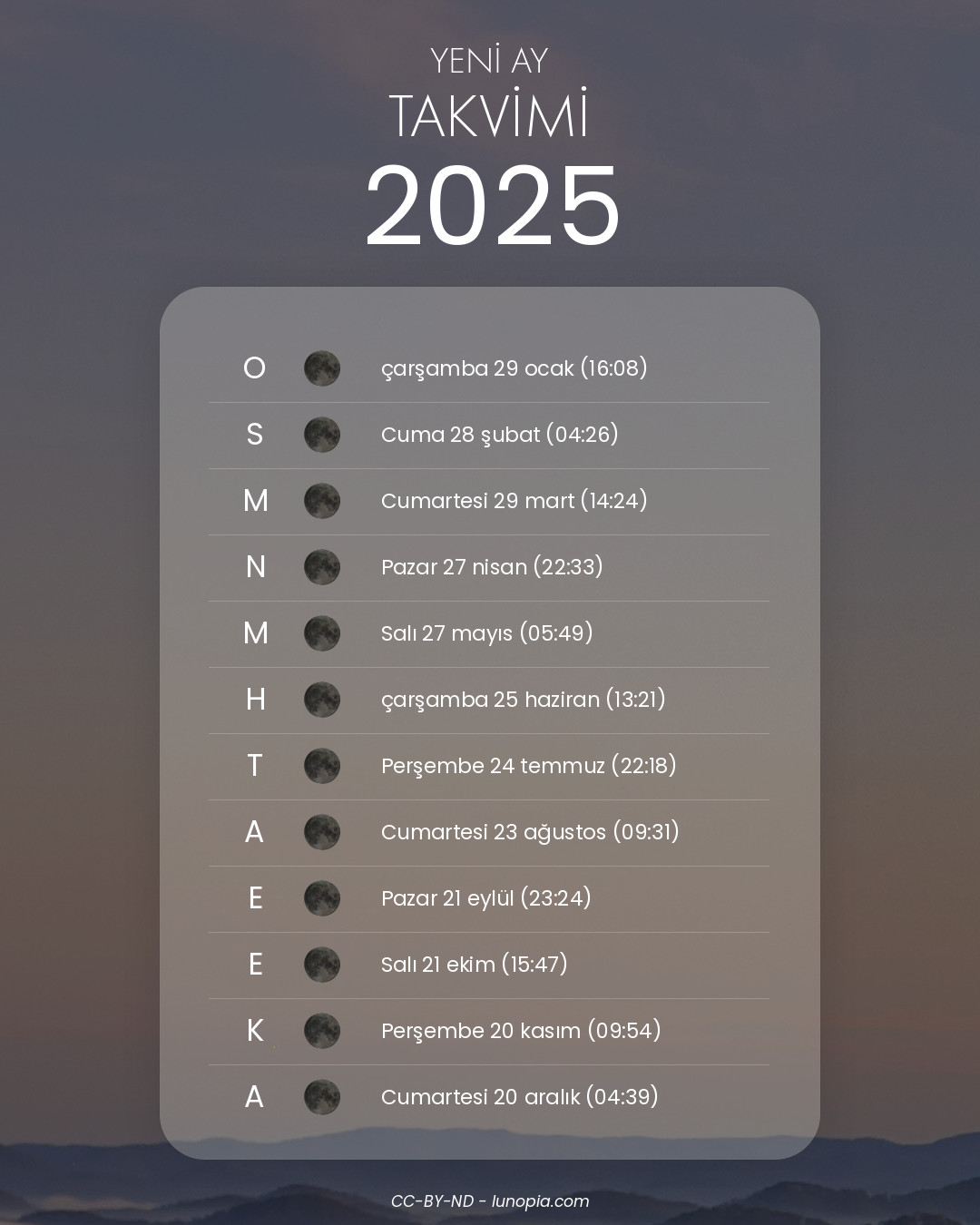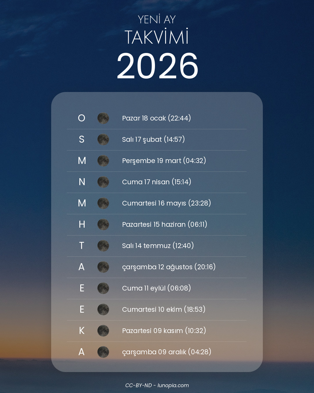 Bir sonraki yeni ay perşembe 20 kasım 2025 tarihinde saat 09:54'de gerçekleşecek (20 gün içinde).